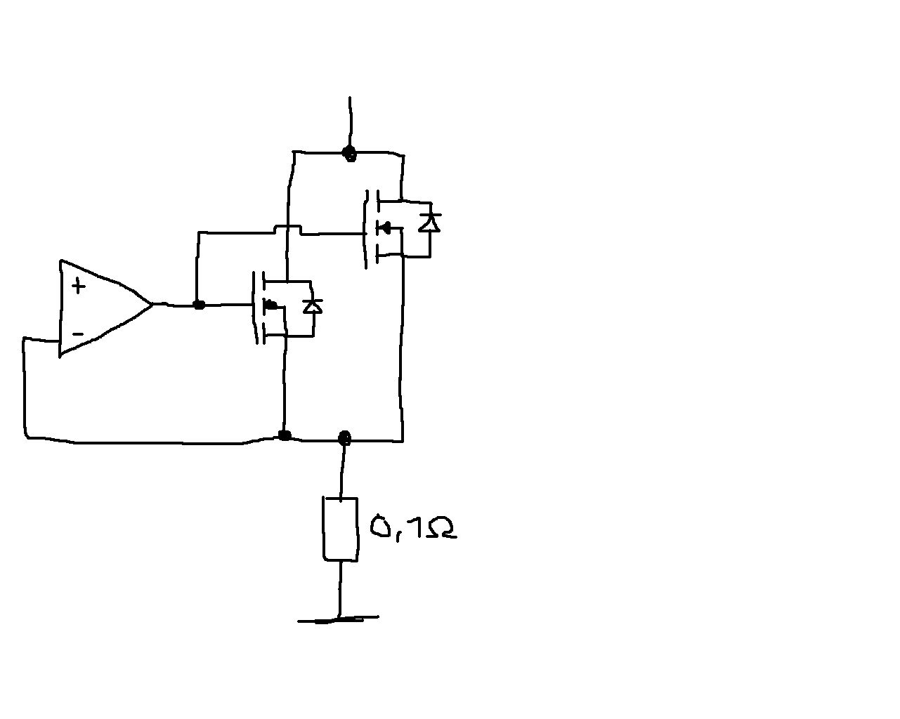 Super :) Hab das mit den Dioden und Widerständen jetzt zwar nicht ausprobiert... aber ich habs einfach nochmal mit nem LM224 aufgebaut und da funktioniert es prima! An was genau hat das jetzt gelegen? Welche Vorraussetzungen erfüllt der 741er nicht? Sry für die doofe Frage aber ich bin noch Anfänger ;) Eine Frage hätte ich noch: Kann ich einfach mehrere Fet's wie in der angehängten Skizze parallel schalten oder muss ich jedem noch einen Widerstand vor's Gate geben das sich die Spannung auf alle Fet's aufteilt? (ohne Spannungsteiler an den Gates würde ja ansonsten theoretisch bei gleicher OPV-ausgangsspannung der doppelte Strom fliesen)