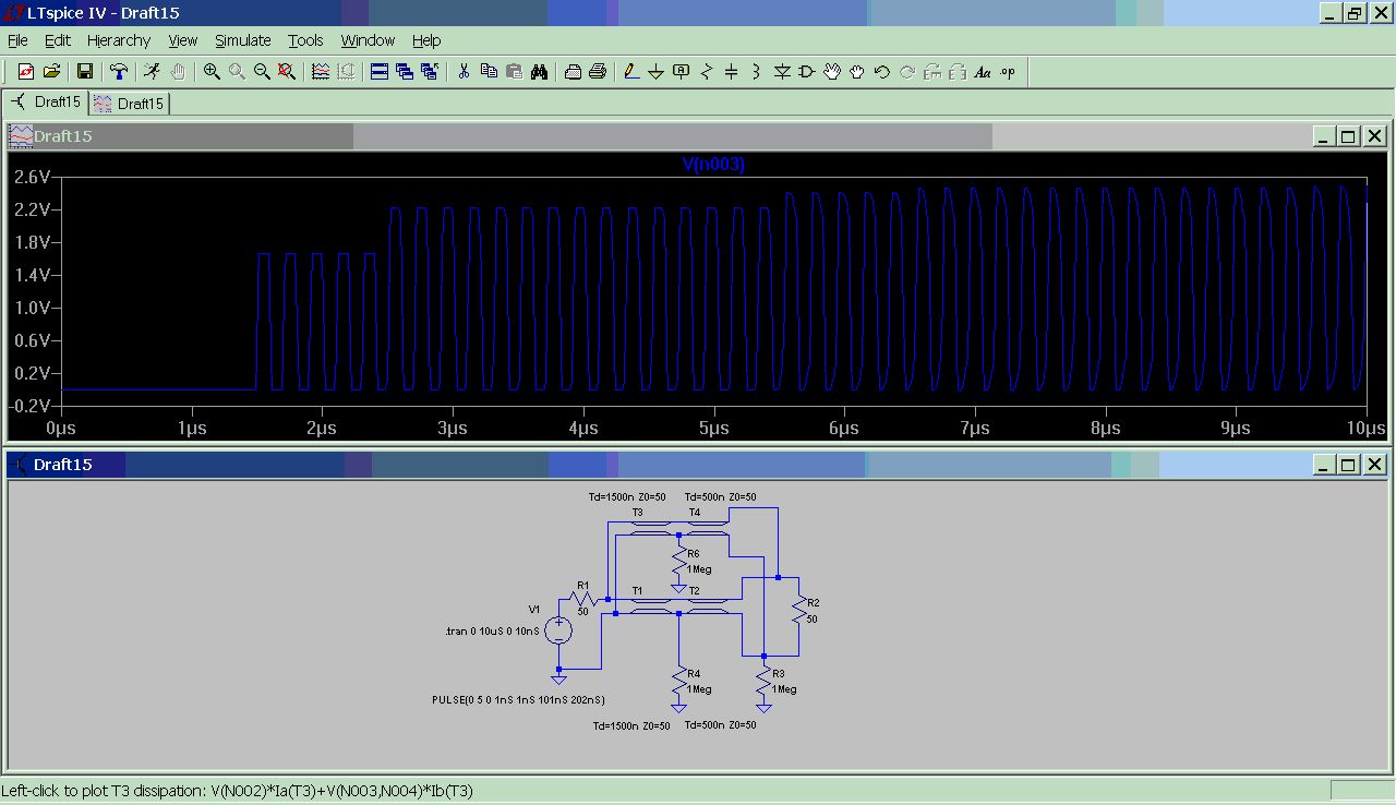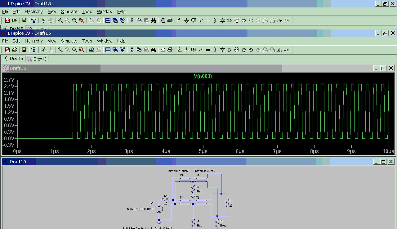 So habe das ganze mal LTSPICE simuliert. Das ganze besteht aus 4 Transmissionlines. T1 und T3 mit 1500nS Delay T2 und T4 mit 500nS Delay. Der Generator liefert 4.9MHz. Die Impedanz der Leitungen betraegt 50Ohm. Da das ganze vom Generator aus gesehen jetzt 25 Ohm hat betraegt der Abschlusswiderstand von Generator und Last 25 Ohm. Die Messung erfolgt zwischen T3 und T4. Hier scheint sich das ganze sauber einzuschwingen.