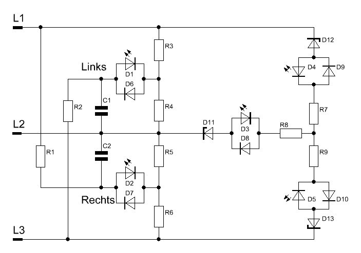 R2 und C1 bilden einen Tiefpass, der gleichzeitig die Phasenlage der Kondensatorspannung verschiebt. Der Tiefpass wird so eingestellt sein, dass bei einem Rechtsdrehfeld die Spannungsdifferenz über der LED "Links" nahezu null ist. Damit ist die aus. Die Led "Rechts" wird aber eine Spannung sehen, da hier zwar eine Phasendifferenz über seinem eigenen Tiefpass liegt, diese aber nicht zum Rechtsdrehfeld passt. Mal dir doch mal die Phasenvektoren des Drehfeldes auf und der Differenzspannungen. (Siehe Aronschaltung: http://de.wikipedia.org/wiki/Aronschaltung)
