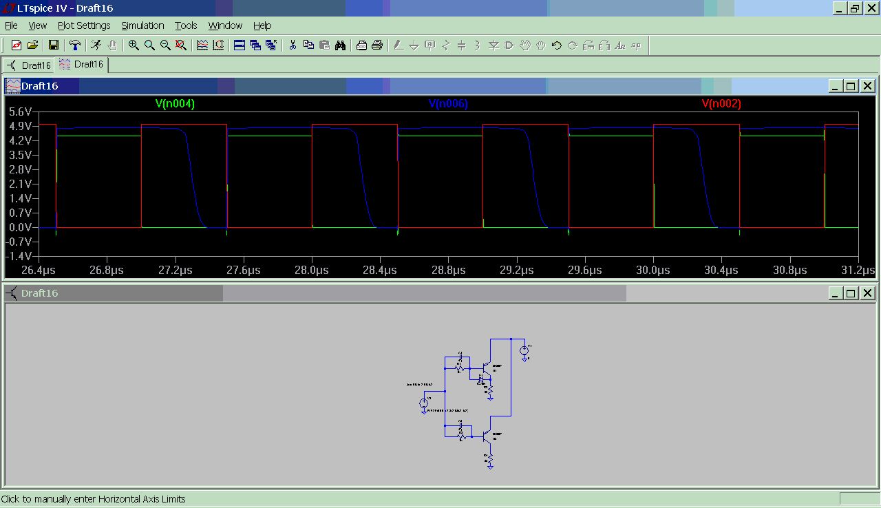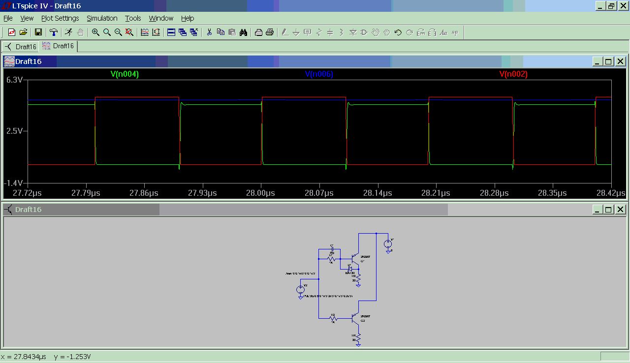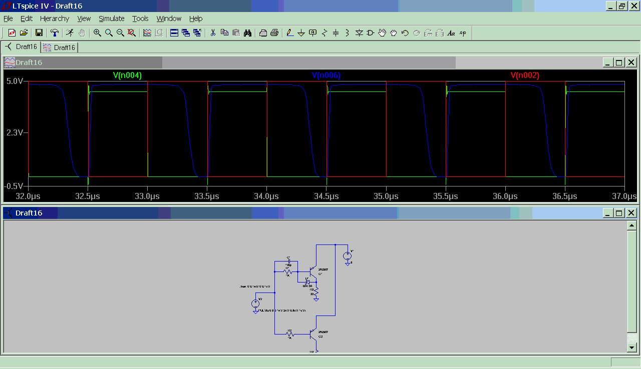 Auch der untere Tranasistor hat jetzt eine C an der Basis spendiert bekommen. Jetzt kannst du den unterschied mit / ohne Diode deutlich sehen.
