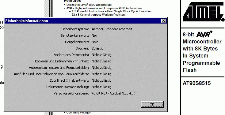 Hi... Dass das 8515-Datenblatt geschützt ist, wird ein Versehen sein, hat vielleicht ein Praktikant zusammengestellt... Kann sein, dass ATMEL das noch garnicht gemerkt hat. ;-(( Die restlichen Blätter sind ja meist ungeschützt. Unter Linux soll es Soft geben, die nicht nach Druck- und Kopiersperre der PDFs fragt. Dies hat mal ein LINUX-Freak erwähnt. Bit- & Bytebruch... ...HanneS...