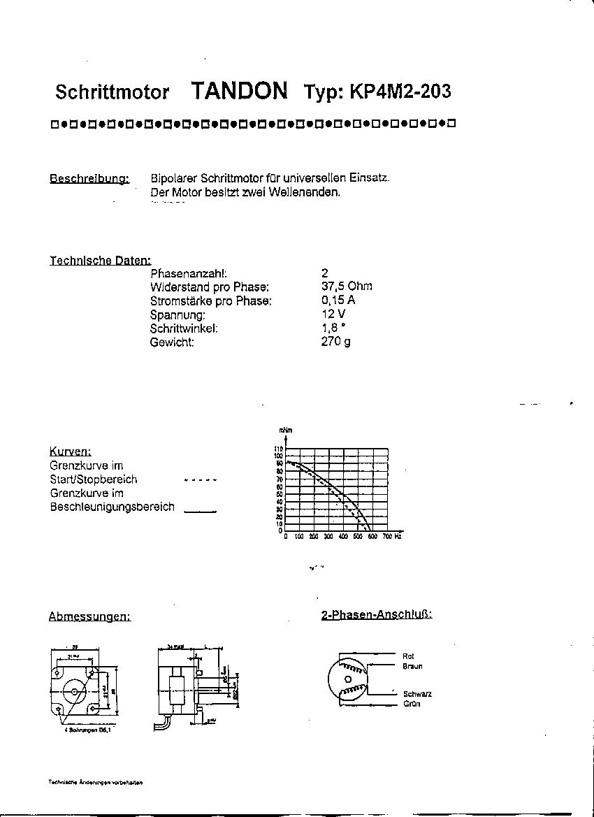 danke für die antwort! ok, fangen wir mal ganz vorne an: >Als Bipo hatte der Motor folgende Datenblattwerte (s. Anhang oben): >Widerstand pro Phase : 37,5 Ohm >Stromstärke pro Phase: 0,15 A >Spannung : 12 V nach dem ohmschen gesetz ist man bei den datenblattwerten von 37,5 Ohm und 0,15 A bei knapp 6V statt bei den angegebenen 12V... also stimmt das Datenblatt nicht!!???