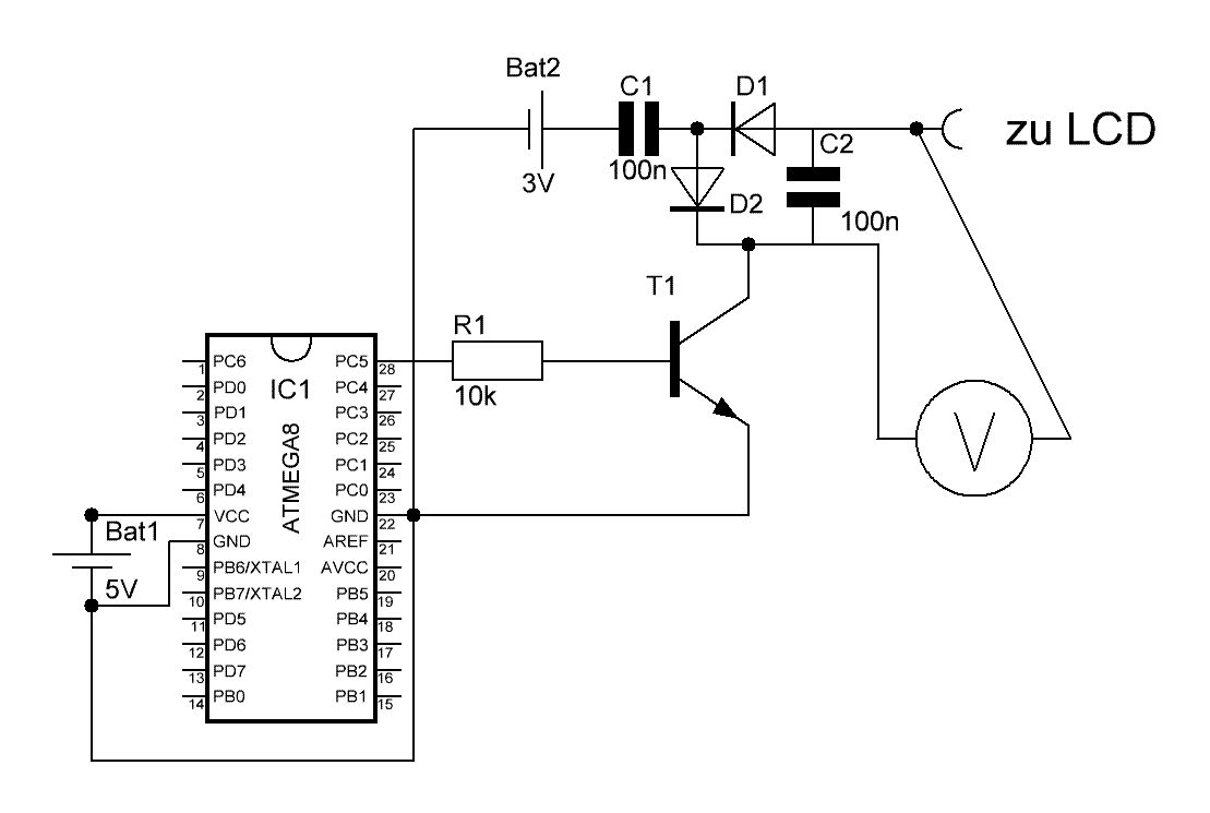 > D2 ist falsch rum eingezeichnet. Tatsache, ist mir auf die schnelle beim Zeichnen nicht aufgefallen, auf dem Steckbrett habe ich sie andersrum ;) > Mehr Power geht mit der Schaltung im Anhang. > Der Takt kann logischerweise auch aus dem uC kommen. Was für eine Funktion hat der 74HC14? Das erschließt sich mir nicht so wirklich, es hängt ja trotzdem alles an dem Pin, der die Frequenz generiert... > Ändern kannst du die Spannung so aber nicht. > Stimmt nicht ganz, Last dran, dann knickt die Spannung ein ;) > Wozu eigentlich ändern, und in welchem Bereich? > Wieviel Strom brauchst du? Ich brauche die Spannung für den Kontrast eines LCDs. Da ich die ganze Schaltung mit Knopfzellen betreiben will, ist mir ein möglichst geringer Stromverbrauch wichtig, deshalb möchte ich auf Spannungsregler verzichten. Da alle anderen Komponenten mit Spannungen von 3-5V problemlos klarkommen, werde ich 3 Knopfzellen nehmen und die Spannung direkt zu den Komponenten führen. Da bei den Batterien aber mit der Zeit natürlich die Spannung sinken wird, verändert sich auch die erforderliche Kontrastspannung. Das wollte ich gerne ausgleichen, indem ich mit einem freien ADC des ATMegas die Batteriespannung messe und mit einem PWM-Port und einem Tiefpass eine Spannung für die Ladungspumpe erzeuge, sodass am Ende genau die benötigte Kontrastspannung dabei herauskommt. Mein Problem ist eben, dass ich nur auf die Teile zurückgreifen kann, die ich hier liegen habe, und das sind nur die absoluten Standardteile. Ist das so überhaupt möglich, und wenn ja, wie kann ich die Ladungspumpe mit der erzeugten Spannung vom PWM-Port und der Frequenz von einem anderen Pin betreiben? Das ist mein Problem, für das ich alleine keine Lösung gefunden habe :( Der Strom beträgt laut Multimeter ungefähr 0,2mA, also nicht zuviel für eine Ladungspumpe. Kontrastspannung muss bei dem Display ungefähr Betriebsspannung - 5V sein, also bei vollen Batterien mit 4,7V ungefähr -0,3V, bei leeren mit 3V ungefähr -2V. >Dafür gibs doch auch noch den ICL 7660 für ein paar cent. Habe ich leider nicht :( >Wenn man am Mega 8 noch einen 2 ten Pin frei hat, könnte man auch 2 Pins für die Ladungspumpe nehmen. Hilft mir bei meinem Problem leider nicht, mein Problem ist ja nicht der Strom, sondern die Spannung, auch wenn das oben vllt. nicht so gut rüber kam. Vielen Dank schonmal für eure zahlreiche Hilfe! Pascal