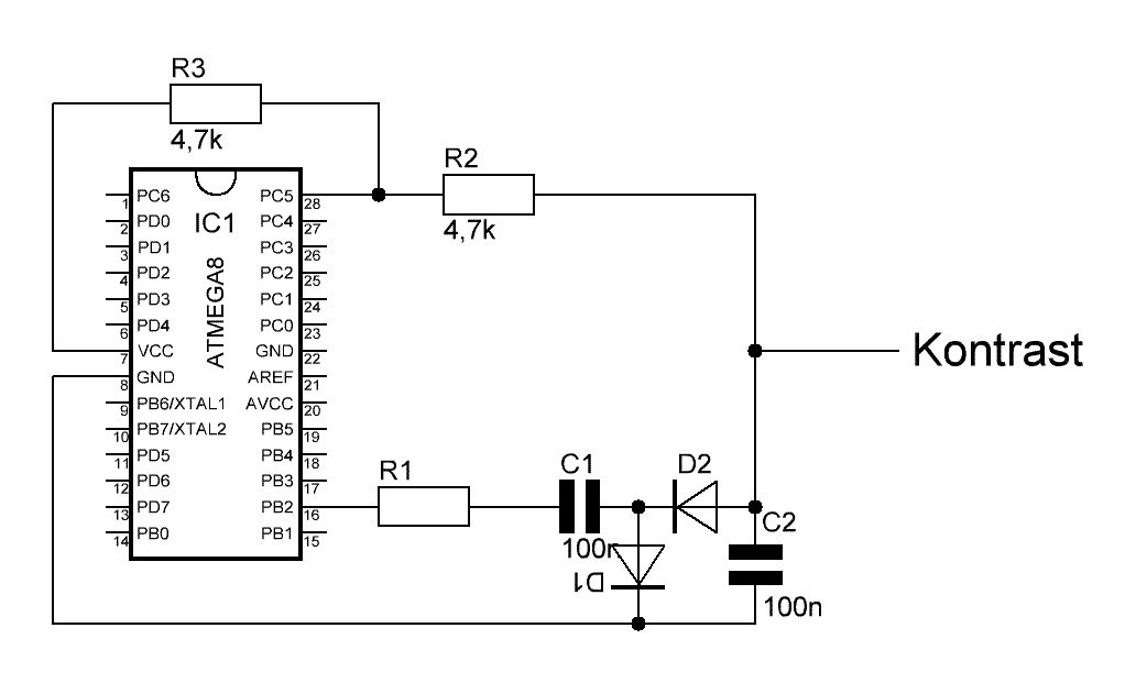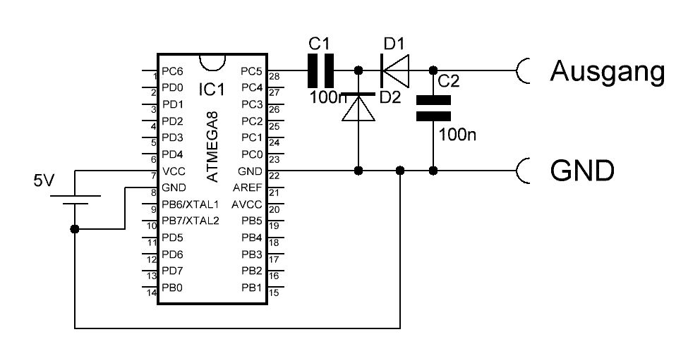 Wenn man am Mega 8 noch einen 2 ten Pin frei hat, könnte man auch 2 Pins für die Ladungspumpe nehmen. Für weniger Belastung und Störungen wäre auch ein kleiner Widerstand (z.B. 50 Ohm) in Reihe zu C1 sinnvoll.