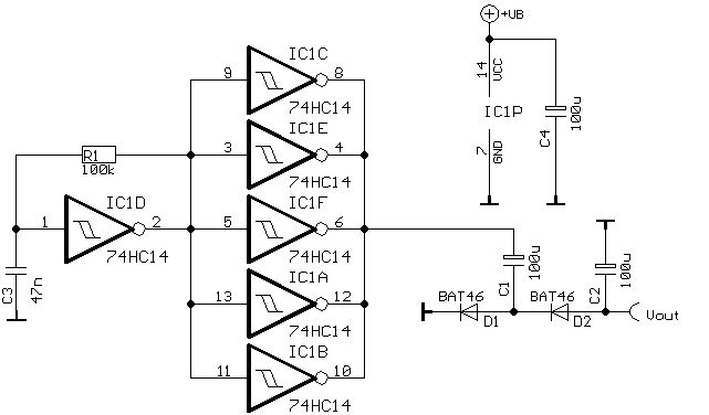 @ Klaus De lisson (kolisson) was willst Du groß drüber reden? Seine Transistorvariante funktioniert nicht, weil es keine Gegentaktstufe ist. Er hat nur einen PullDown-Transistor, aber keinen PullUp. Eine Ladungspumpe lebt ja vom hoch- und runterziehen der Eingangsspannung. @ Pascal D. ich würde sagen - mach es so, wie von Benedikt vorgeschlagen. Extra Transi brauchste bei der geringen Last nicht. Damit sich die Ladungspumpe auch gegen 0V regeln läßt, brauchste natürlich immer eine Last dran - irgendwas brauchste ja, um die Pumpen-C's wieder entladen zu können. Die Spannung, die dabei so rauskommen dürfte, wird wohl einem Spannungsteiler entsprechen, bestehend aus dem Last-R, und dem Treiber-R (µC-Ausgangs-R + Serien-R zw. Ausgang und Pumpe, falls vorgesehen), wobei der Treiber-R mit dem Tastverhältnis eingeht (ich würde sagen R/t, mit R als Treiber-R, und t als Tastverhältnis)