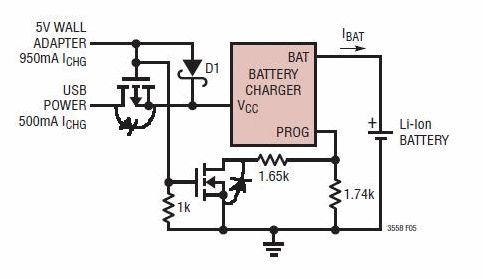 Im Datenblatt eines Ladereglers ist folgendes Schaltbeispiel um den Chip per USB oder Netzteil zu versorgen. Falls der Chip mit einem Netzteil versorgt wird, wird durch den Widerstand 1,65K der max. Ladestrom erhöht. Nun hab ich folgende Fragen: 1. Schaltet der Mosfet MP1 überhaupt durch wenn keine 5V vom Wall Adapter anliegen? 2. Irgendwie finde ich kein SMD-N-Mosfet. Alle Mosfests die ich bis jetzt gefunden habe, haben bereits eine Diode integriert. Im Datenblatt ist der Mosfet jedoch ohne Diode eingezeichnet.