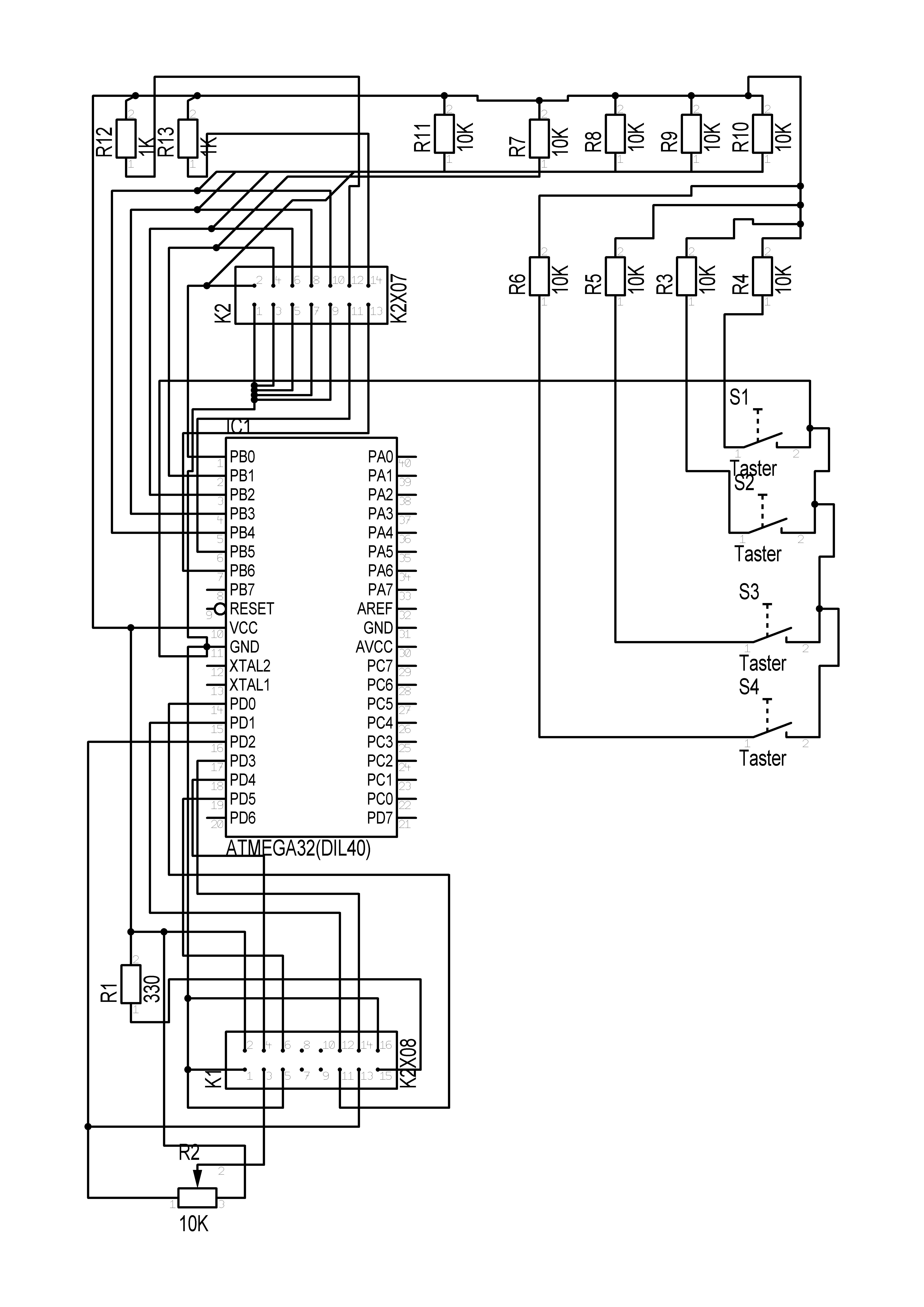 Und zeichne mal einen vernünftigen Schaltplan; auf dem geposteten ist ja überhaupt nichts zu erkennen. Ausserdem: Die Taster sind nicht am Controller angeschlossen. Ein bisschen mehr Beschriftung täte auch gut; so kann man dann auch die Buchsen zuordnen.