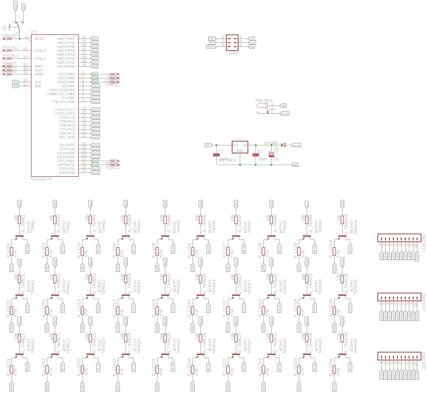Moin, auf Anraten eines Bekannten möchte ich hier mal einen Entwurf für eine Lichterkette mit MC-Steuerung zur Diskussion stellen, bevor ich den Kram auf eine Platine ätzen lasse. Grundsätzlich geht es darum, dass Signale vom MC per Transistor 30 LEDs steuern. Die teilen sich eine Stromquelle mit dem MC, es werden über Steckdose 9V angeschlossen und der Strom durch die LEDs wird an den 470-Ohm-Widerständen auf 20mA begrenzt. Die Transistor-Blöcke im Schaltplan sind alle identisch und nur mit unterschiedlichen Signalen vom MC verbunden (und natürlich unterschiedlichen Lichtern). LEDCON1 bis 3 sind Steckverbinder als Schnittstelle zu den LEDs. Der Bereich um den Spannungsregler ist direkt von einem MC.net-Tutorial übernommen und funktioniert nach meiner Erfahrung. Allerdings bin ich mir nicht sicher, ob sich der Stromkreis vom MC und der von den LEDs nicht irgendwie negativ beeinflussen. Nur der Vollständigkeit halber, die Lichter sollen drei zehn-LED-lange Stränge runterfallen und dabei über Pulsweitenmodulation eine verblassende Leuchtspur hinterlassen. Das Programm dafür steht aber und ist in Assembler geschrieben, der MC ist ein ATmega16L. In jedem Fall danke für die Zeit und jeden Hinweis oder Tipp, viele Grüße, Jay
