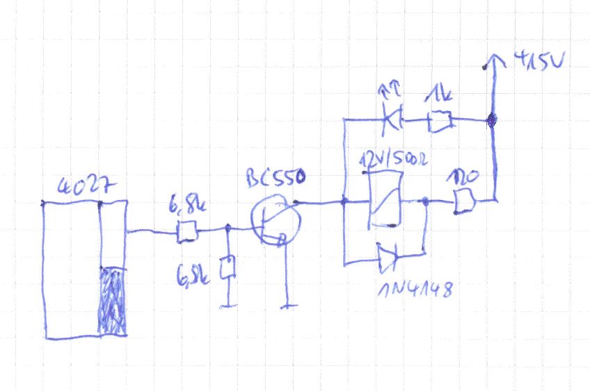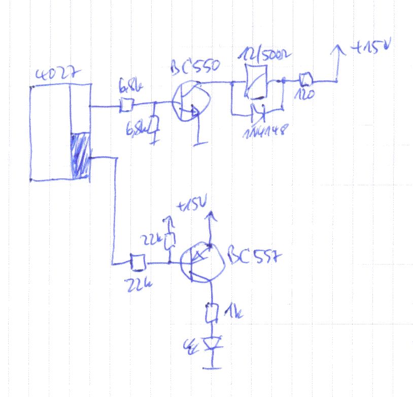 Hallo Ulf, mit zwei LEDs ist das eigentlich doppelt gemoppelt. Ich würde das lieber so wie im Anhang machen, entweder auf die eine oder andere Art. Ein 24V Relais ist nicht so gut geeignet für eine 15V Versorgung. Deswegen habe ich die 12V Version gewählt. Der 120 Ohm Widerstand begrenzt die Spannung für das Relais auf rund 12V. Der Transistor, der das Relais treiben muß, braucht genügend Basisstrom. Deswegen sind hier 6,8k Widerstände besser. Darf ich fragen, was dir am Analogschalter nicht gefällt? Kai Klaas