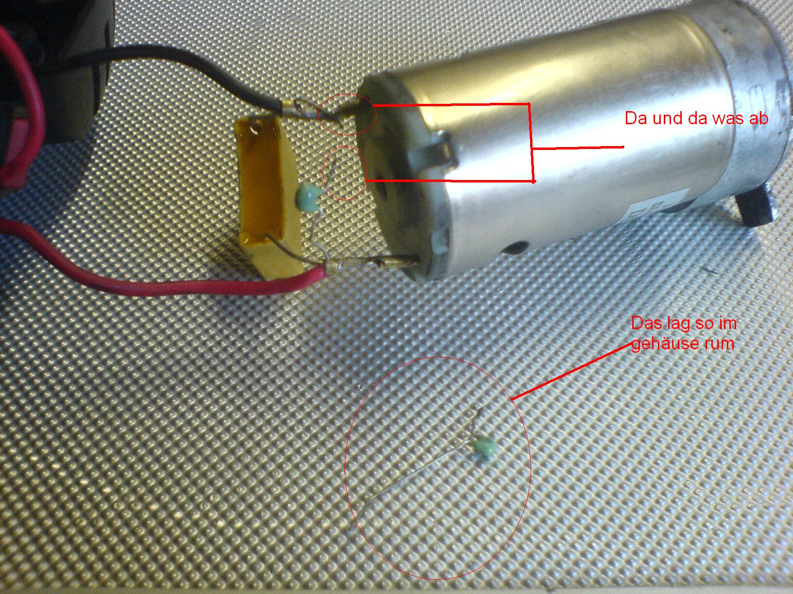 ich kenne es so, dass ein Kondensator zwischen den beinen Polen ist und einer ist von einem Pol gegen das Motorgehäuse, um Störungen zu vermeiden... Aber deswegen sollte der Motor trotzdem noch laufen...