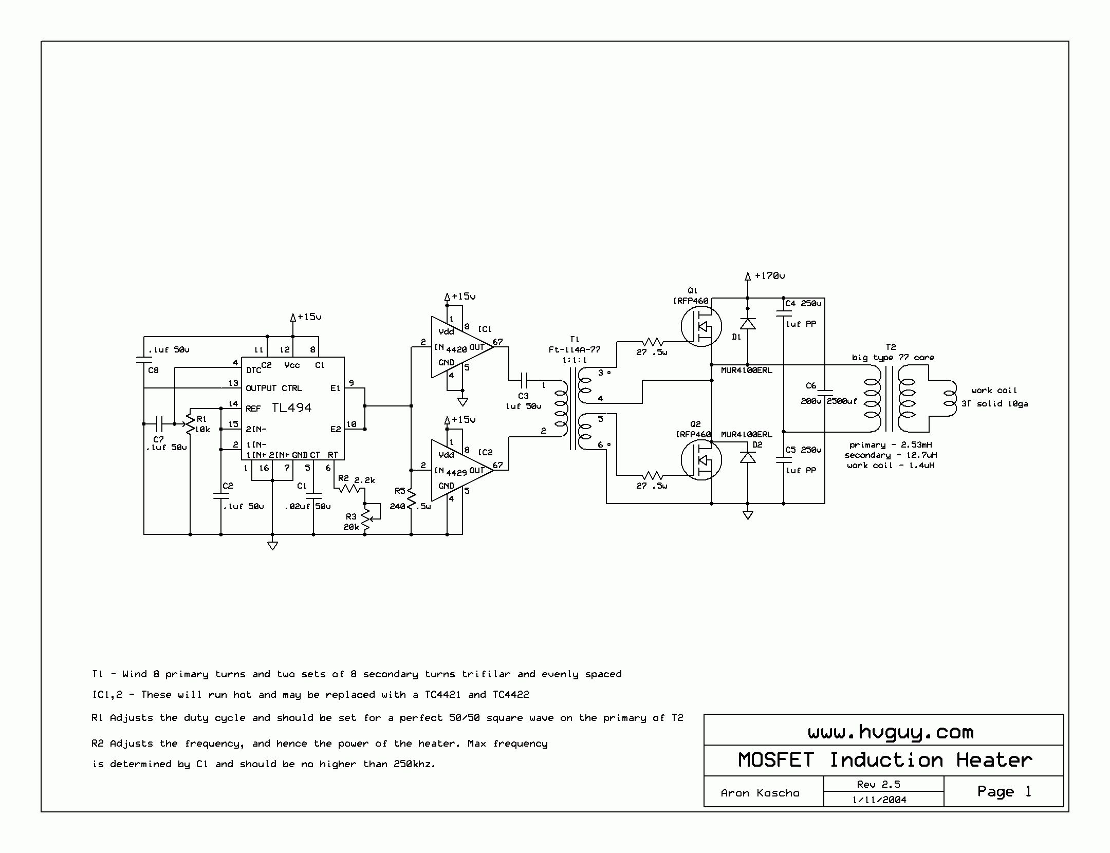 Hallo ich habe vor längerer Zeit auch mal verucht eine Induktionsheizung bzw. einen Induktionsschmelzofen zu bauen. Leider sind mir die IGBT´s um die Ohren geflogen ,warscheinlich weil ich nicht so viel Ahnung davon hatte. Na ja ich habe mal ein paar Schaltpläne und ein Exel Progrann und noch eine PDF Datei angehänt die gefunden habe.Vieleicht hift es . Gruß Heiko