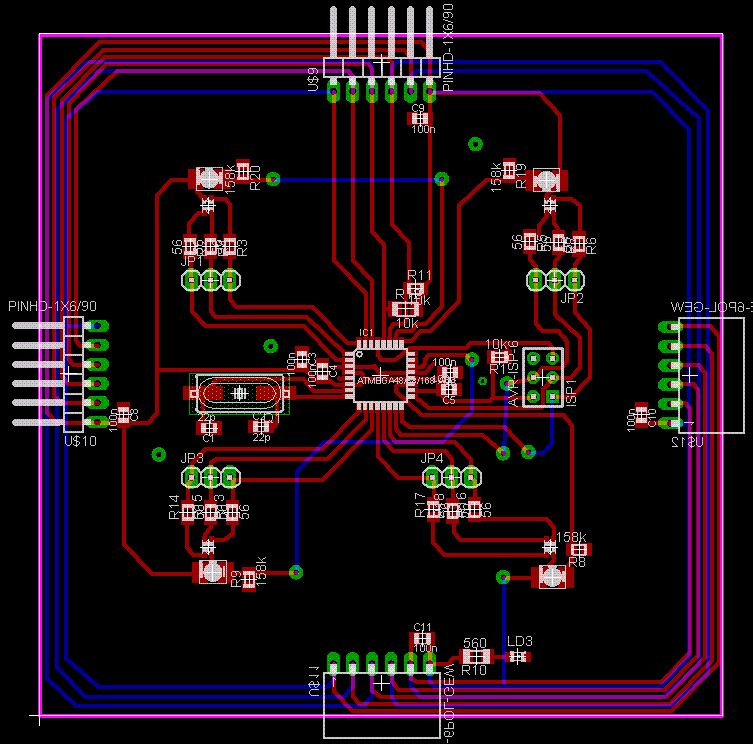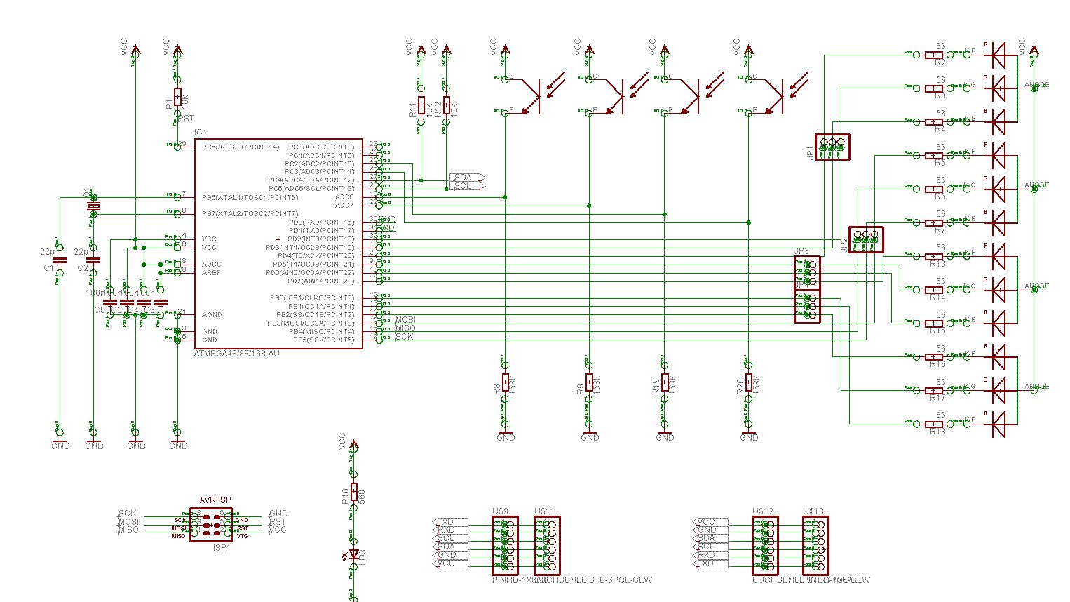 So habe die Testplatine fertig sind nen paar dinge drauf die später nicht mehr gebraucht werden ich hoffe einfach mal das in der hardware keine fehler sind allerdings wird es mit der software wohl recht aufwändig werden die platine stell ich denke ich bis spätestens Sonntag abend fertig Vorläufiger preis einer Platine: 1,5 MEAGA48 1 Fototransistoren 2 Platine 1,5 Steckverbinder 1-2 für Hühnerfutter 1 LEDs... = 8€ und ich brauche 25 davon ...mist naja vll kann ich ja noch 1 bis 2 euro einsparen wenn ich mich mal nach alternativen zu reichelt umschaue da ich recht viel brauche fallen die versandkosten ja dann auch nicht mehr so ins gewicht... ach so die platine ist recht quick and dirty habe aber keine lust ewig daran rumzuoptimieren