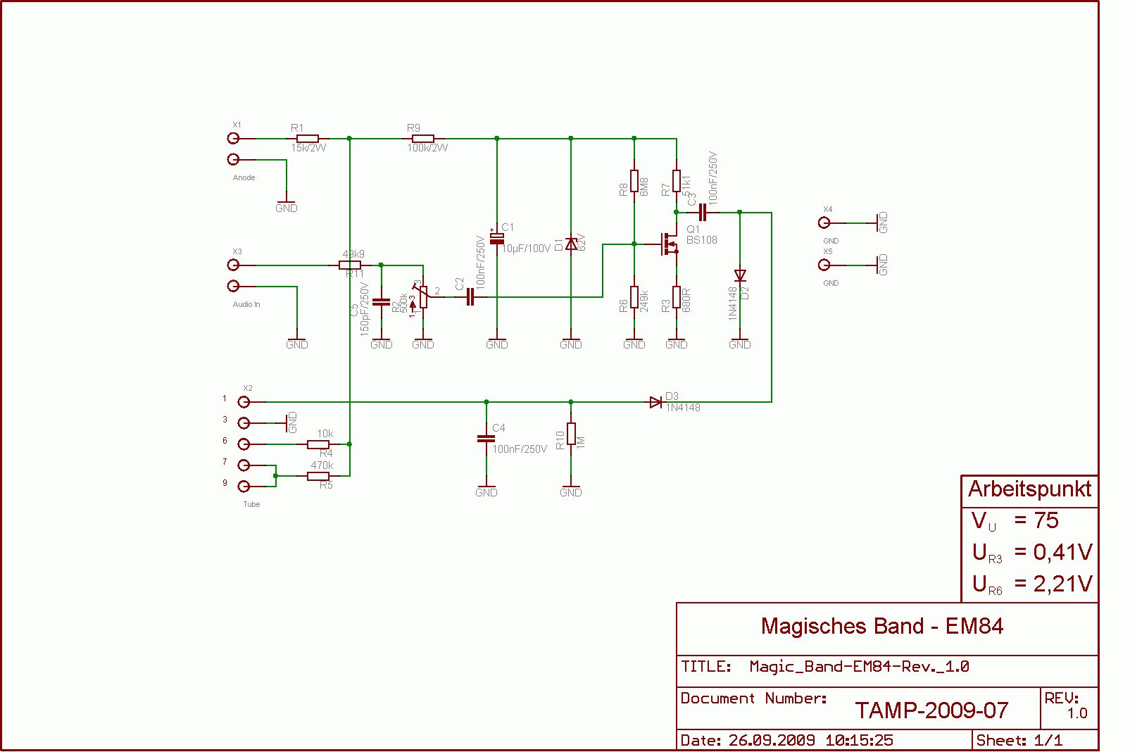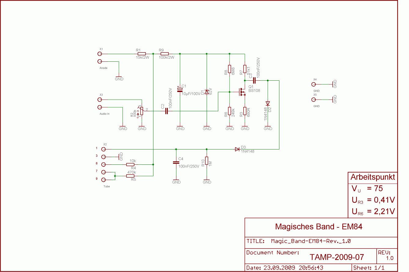 Ich habe eine aehnlich Schaltung mit BF245 als Treiber fuer EM80/EM84 gebaut. Da der Treiber vom NF-Signal eines Roehrenverstaerkers angesteuert wird, ist hier kein Niederfrequenzfilter erforderlich. Mit was fuer einem Signal wird deine Schaltung angesteuert ? (NF-Ausgang Verstaerker,..)