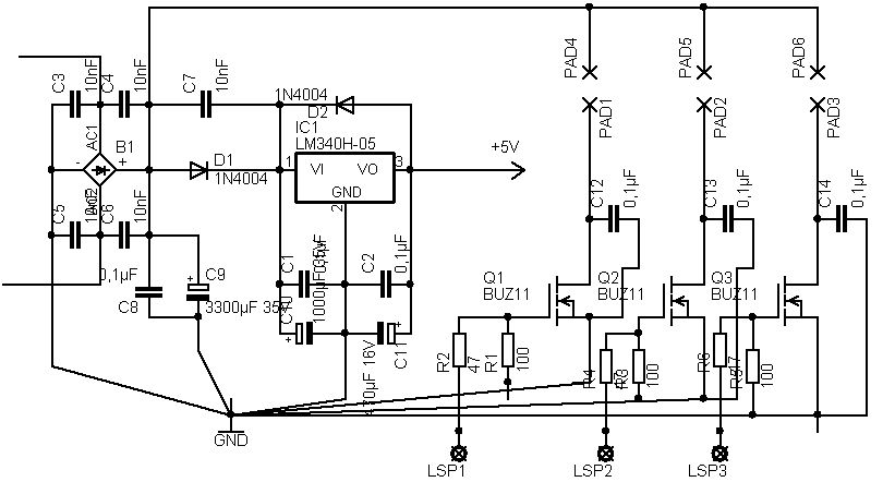 Halogenlampen? Die sind kalt extrem niederohmig... Glühlampen sind sowiso Kaltleiter, da muss man auch an den Einschaltstrom denken, der ein Vielfaches des Dauerstroms (warm) beträgt. Deine MOSFETS müssen also mehr als 3A aushalten. Auch dein Trafo wird beim Einschalten der kalten Lampen etwas in die Knie gehen, das kann er zwar ab, aber seine Spannung bricht ein. Deshalb unbedingt eine Diode von + (da wo der Ladeelko hin muss) zum Spannungsregler und dort noch einen Elko zum Überbrücken der Nulldurchgänge und evtl. Spannungseinbrüche an den Reglereingang (zusätzlich zum 100nF). Ladeelko alleine bringt nicht sehr viel, weil den die Lampen in Nullkommanix leerlutschen. Es muss also ein von der Last abgekoppelter Ladeelko sein. - Oder ein zweiter Trafo... - Oder Batterien... MfG, Heinz