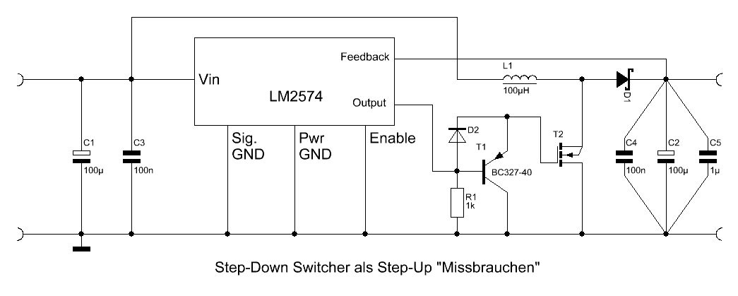 Hallo Es geht meiner Meinung nach auch ohne externen MosFet, wenn man mit dem Umdrehen der Spannung leben kann. Im Anhang das Bild aus dem Datenblatt für den LM2576 als Buck-Boost-Wandler mit Spannungsinvertierung. Ob es mit dem LM2574 auch geht? Sehr wahrscheinlichm aber ich bin zu faul um nachzuschauen. Außerdem ist der LM2576 bei R***t noch billiger als der LM2574. Gruß, Wolfgang