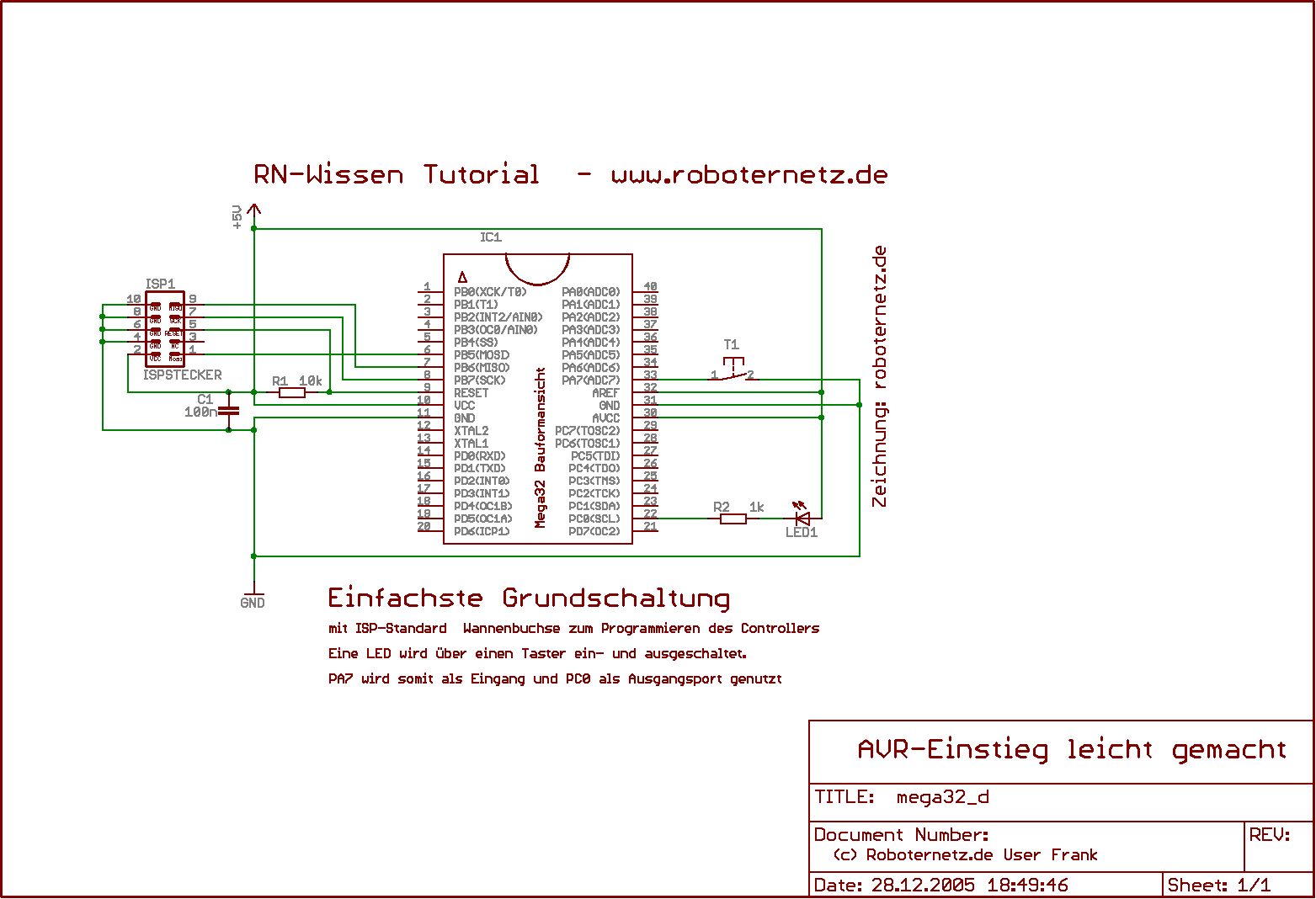 Hi, habe folgendes Anfängerproblem. Zum programmieren nehme ich das STK500 mit einem Mega32. Beim tasten auf PA7 soll eine LED an PC0 geschaltet werden. Das Programm funktioniert auf dem STK500 ohne Probleme aber wollte nun das ganze auch auf einem Steckbrett probieren ohne die ISP Schnittstelle. Dies schaut dann so aus (nur ohne die ISP Schnittstlle) http://www.rn-wissen.de/images/3/3c/Avrtutorial_grundschaltung_mittaster.gif Bei der Schaltung oben flackert die LED unkontrolliert und der Taster hat überhaupt keinen einfluss. Was mache ich falsch? Hab ich iwas vergessen? Danke im Voraus für eure Hilfe. Gruß Sascha