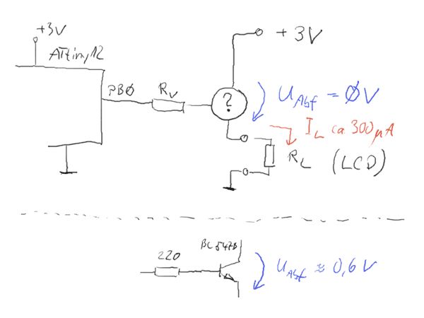 Ich möchte mit einem IO-Pin des ATtiny12 einen Verbraucher (LCD-Modul) bei Bedarf ein- bzw. ausschalten (siehe Bild im Anhang). Die Stromaufnahme I(L) des Verbrauchers liegt bei max. 300 uA, die Spannung darf aber nicht unter die 3V sinken, die als Betriebsspannung des Gesamtsystems zur Verfügung steht, U(Abf) sollte also nahezu 0V sein. Mein erster Versuch (unten im Bild) mit einem BC547 ergibt einen Spannungsabfall von etwa 0,65 Volt. Ich nehme an, das der Transistor nicht voll durchschaltet. Aber selbst wenn er es täte, bliebe ja immer noch ein U(CE) von 0,2V (?) übrig. Ein Relais geht übrigens in dem Fall nicht, falls jemand auf die Idee kommen sollte :-) Ich denke, das hier wohl ein MOSFET die Lösung sein könnte, kenn mich aber damit gar nicht aus. Was für einen Typ könnte ich da nehmen und wie muß der dann beschaltet werden? Besten Dank und Gruß Ingo