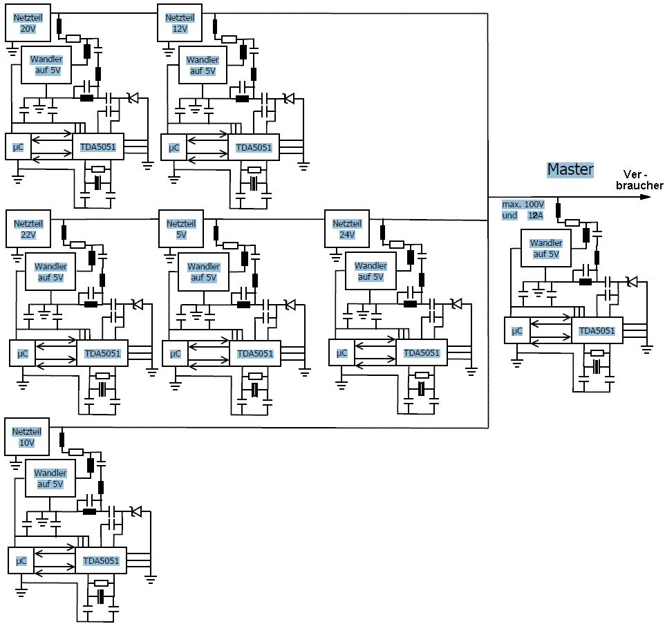 Hallo, ich habe mal ein (Beispiel-) Bild zusammengeschustert, damit ihr eine Vorstellung habt wofür ich diese Schaltung benötige. Ich möchte durch die Slaves die Daten der Netzeile (ob an oder aus, V, A, P usw.) an den Master übertragen. Die Messung und die Verschaltung der Netzteile existiert bereits. Mir geht es hier nur um das Problem der Übertragung über die Leitung. Die angegebenen Netzteilwerte und die Verschaltung (Reihe oder ||) sind nur Beispielhaft, dass einzige was sicher ist, sind die max. 100Volt und 12Ampere die "hinten" rauskommen. Meine Fragen dazu: Ist das von euch Erwähnte immernoch gültig? Funktioniert das mit dem Polling auch bei dieser Schaltung? (wegen Reihe und ||) Muss ich die "Koppelspule" jedem Netzteil anpassen, oder kann ich eine Größe (z.B. die bereits im Bild von John verwendeten 1mH) für alle Netzteile verwenden? Danke MfG
