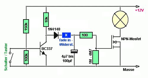 Hey Leute Hab so ein ähnliches Problemchen: Ich möchte LED's mit einem Fade IN und Fade Out Effekt ausstatten, jedoch muss es mit einem MosFet funktionieren (Buz11), hab schon einige getestet, aber entweder machte der MosFet nichts oder wenn der Taster losgelassen wurde dann dauerte es noch einige Sekunden bis der MosFet wieder langsam die LED verdunkelte. Hab mal den Schaltplan angehängt, bei dem es noch einige Sekunden dauerte bis der MosFet reagierte. Also was ich will ist ne Schaltung die, wenn der Taster losgelassen wird dass dann sofort der Vorgang mit dem verdunkeln beginnt. Hoffe irgendjemand hat da ne Lösung. Vielen Dank im voraus !!! (-: