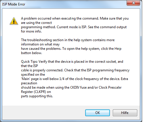 >ISP frequency must be 5 kHz or above when programming EEPROM or FLASH! Das ist normal, sonst würd ja auch keine meldung vom AVR Studio dazu existieren. Hast du Widerstände in den ISP Datenleitungen ? Wie schaut die Schaltung aus die du flashen willst ? Wie ist der Programmer aufgebaut ? Exact nach Schaltung ?