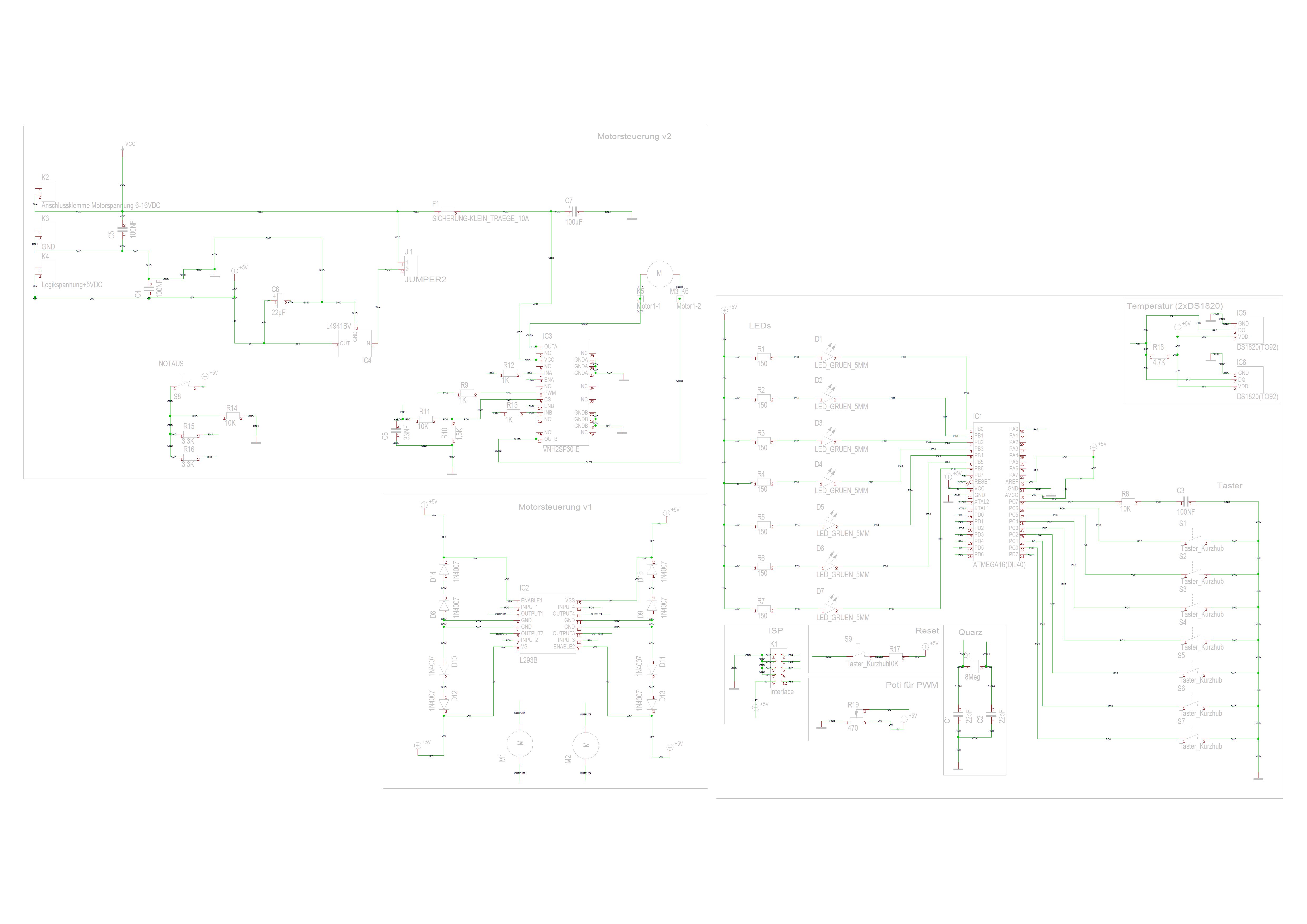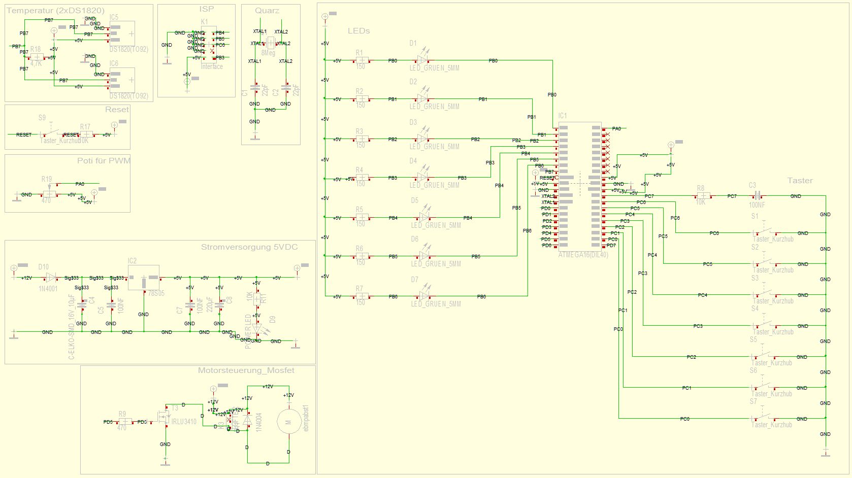 Hallo zusammen, die letzte Tage habe ich mich an meinem ersten uCProjekt versucht. Könntet Ihr bitte den angehängten Schaltplan prüfen. Folgendes soll realisiert werden: - Steuerung eines DC Motors (9-15VDC bei 1.8A) via Atmega16. Hier habe ich 2 Varianten, wobei ich der Ansicht bin, die Variante 2 ist die einzig Richtige der Beiden. - Taster dienen zur direkten Programmwahl einer bestimmten Drehzahl - Poti umgeht die vorgenannte Drehzahl und kann 0-100% Leistung regeln. - Temperataursensoren DS1280 dienen zur Temeraturmessung an 2 Messpunkten. Das Ergebnis her hat aber keinerlei Einfluss auf Drehzahl etc. Diese Werte sollen später nur angezeigt werden (PC) Wenn Ihr mir hierbei also unter die Arme greifen könntet, ist das super. Gruß Holger