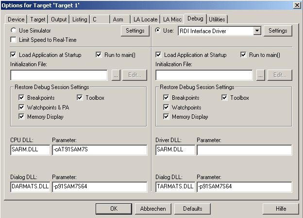 Hi der fehler ist das Keil versucht das Taget zu updaten. Dafür hat Keil einen anderen Dialog unter Options->Utilities dort musst du auch das RDI Interface wählen. 2. Tip nimm doch das direkte Interface für Segger. Das sollte für die 3.8 vers gehen 3. Tip installiere bitte die Segger Treiber nicht in c:\programme sondern in C:\Keil\ARM\Segger weil Keil sonst die Treiber aus dem Pfad nimmt und Windows die DLLs aus c:\programme. Das passt leider nicht immer zusammen. 4. Tip die neuesten Segger Treiber verwenden. Ich hatte schon den Effekt das beim Single Step die SW Brakpunkte nicht funktionierten. Gruß