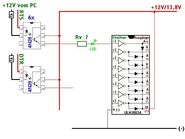 Hi, ich weiss nicht genau ob das so funktioniert wenn ich die LED direkt in die Leitung zum Eingang gebe. Welchen Wert für Rv soll ich nehmen? 560 Ohm? Und eigentlich will ich dass wenn der ULN durchschaltet, PLUS geht. Also muss ich da immer noch einen PNP Transistor anhängen der mir das Signal umdreht. Oder gibts einen IC der wie der 2803 funktioniert (mit Dioden drinnen) aber anders herum? lg Triti