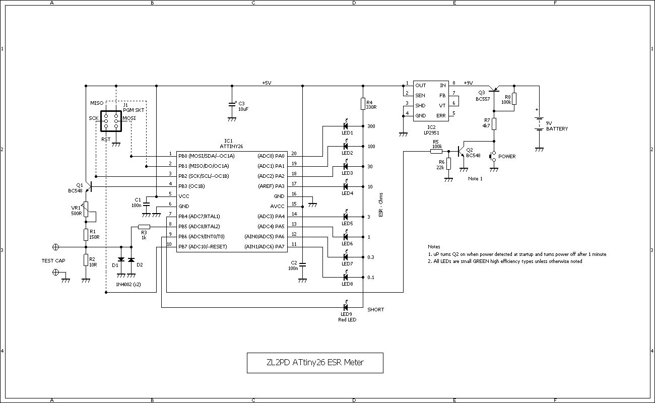 Hallo, Die Elektor-Schaltung findest Du hier: http://www.elektor.de/jahrgang/2002/september/in-circuit-kondensator-tester.58969.lynkx?tab=3 Das dort vorgestellte Prinzip mit Synchrongleichrichter habe ich ebenfalls in einer Schaltung verwendet. Da ich den ESR-Tester eher selten brauche war mir das Ganze mit eigener Anzeige zu aufwendig. Ich habe daher einen Meßzusatz für das vorhandene DMM aufgebaut. Den Oszillator habe ich durch einen PIC12C508 ersetzt. Die ganze Schaltung ist jetzt ca so breit wie der Abstand der Meßbuchsen am DMM und ca 6 cm lang.