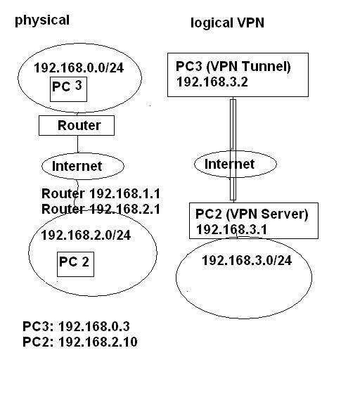 Ok wenn du sags das PC 2 Routen muss. dann wäre es richitg natührlich richtig. den auch routen zu lassen... Mit deiner Zeichung kann ich ncihts anfagen. Da fehlt es an jeder ecke... wo stehen die router welche IP haben sie... wer soll den mit wem reeden.. Warum bracuhen die PC noch ne Verbindung über nen VPN zueinander.. Sorry... da bin ich so raus weil ich es einfach nicht begreife was du überhaubt bezwecken willst. Momentan sieht es für mich auch wie ne "Home" bastel geschichte. Normalerweise würde man in einem Netzwerk einen Router haben mit genügend interfaces der Zentral alles macht, so das die enizelnen Client PC nicht benötigen als eine verbindung.