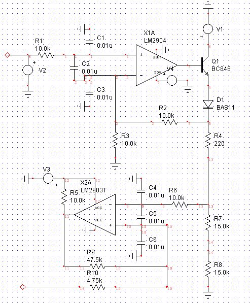 Hallo Ic ~ Ie. Die Eingänge der OPs kannst du vernachlässigen. Dann hast du das Potential an der Diode= 2x V2. Der Strom ist dann gegeben durch 2xV2/ ((R2+R3)||(R4+R7+R8))= Ic