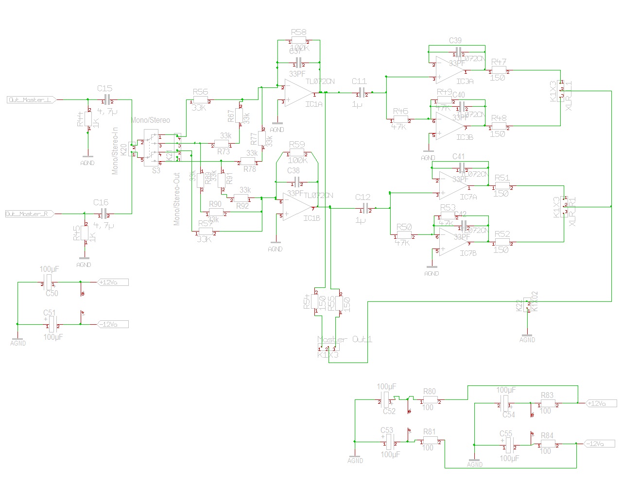 100 Ohm für die Vorwiderstände der OPAMPS ist wohl ein bischen sehr hochohmig. Versuche mal 10 Ohm. Was für einen OPAMP verwendest Du überhaupt? Hast Du die Masse auch an den Lautsprecher geführt? Also K22 gebrückt, Masse an den Schirm des Kabels gelegt und den an den Lautsprecher gelegt. Schließ die Box mal asymmetrisch an. D.h. Masse am Lautsprechereingang mit Minuseingang brücken. Masse deiner Schaltung an Masse der Box und dann mal den nichtinvertierenden oder invertierenden Ausgang an den Eingang der Box klemmen.