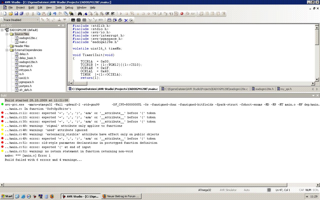 Hallo, Du hast einen Parser Fehler. Versuch mal ein ; in eadogm128e.h extern void SoftSpiWrite (unsigned char data_out); <---------- Aber das steht auch in der Fehlermeldung vom AVR Studio. Liest Du die denn auch sorgfältig ? Gruß Sven
