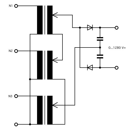 Bei galvanisch getrennten Ausgängen müsste auch das gehen: Zwei Phasen und eine invertierte Phase addieren -> 0..460V RMS (650V Spitze). Und anschließend eine Delon Schaltung -> 0 bis ca. 1280V=.