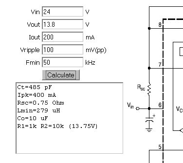 Die Kapazität hängt bei der Berechnung mit dem Tool, bzw. den Formeln aus der AppNote vom Ausgang/Eingangsspannungsverhältnis ab, sowie der als Fmin eingestellten Frequenz. Wobei der Begriff Fmin aber streng genommen falsch ist: Aufgrund der Auslassung von Impulsen sinkt die Frequenz bei kleinen Lasten nämlich deutlich darunter. Gemeint war wohl die minimale Frequenz beim kontinuierlichen Betrieb. Sobald ein Überstrom auftritt verkürzt sich die Einschaltdauer und somit steigt die Frequenz an. Weiterhin macht der 34063 keine echte PWM, sondern arbeitet (bis auf wenige Ausnahmen) mit einem festen Tastverhältnis von etwa 6/7 Von daher lassen sich die Berechnungsformeln aus dem Datenblatt mit dem ton/toff Verhältnis aus der AppNote eigentlich auch nicht wirklich anwenden, da die ton Zeit meist fest ist. Und diese wird nur durch den Kondensator bestimmt (außer die Spannung fällt erst während einem Einschaltzyklus unter den Sollwert und solange kein Überstrom auftritt). Von daher ist dieser für die prinzipielle Funktion der Schaltung weitestgehend egal, er hat nur vor allem einen Einfluss auf den Ripple bei kleinen Lasten.