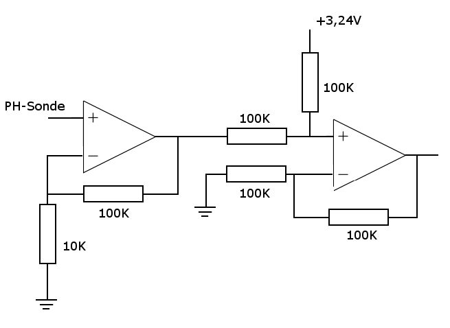 Gemacht, getan, jedoch ohne positives Ergebnis. Die Ausgabe sieht immer noch genauso aus und es findet auch keine Verstärkung mehr statt. Ob nun die 3V Batterie dran hängt oder die PH-Sonde, ich habe ständig nur 4,16V hinter dem 2. Verstärker, gemessen mit einem Voltmeter. Auch mit dem Max kriege ich nix neues eingelesen, nicht einmal die 4,16V.