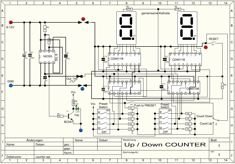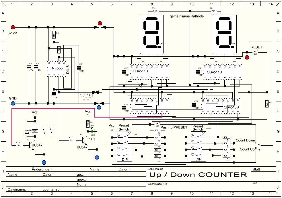 Hallo Leute! Bin neu hier und habe eine Frage und Bitte an Euch. Habe eine BCD Counter und würde dazu Hilfe benötigen, wo die Relaisschaltung angeschlossen wird, welche sich nach der voreingestellten Zeit aktiviert. (z.B. nach 35 Sekunden) Da ich diese Schaltung insgesamt 12x benötige, sind es 12 unterschiedliche Zeiten, die sich aber immer wieder ändern können. Schaltung des Up/Down Zählers habe ich beigefügt.Bleibt der Anschluss des Relais in diesem Falle immer gleich?? Danke für Eure Unterstützung bei meinen Problem, habe leider im Internet nichts derartiges gefunden. Schaltplan des Zähler und Schaltplan der Relaisschaltung sind im Anhang.