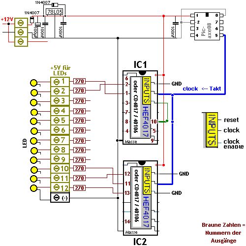 Hi, danke für die links. Nein, Zähler brauch ich nicht, das macht der Picaxe der jede Stunde 1 Signal gibt. Die Schaltung vom elektronik-kompendium ist viel zu kompliziert und braucht mir auch zu viel Platz den ich nicht hab. >Such mal nach 4017 Lauflicht. Hab ich reichlich. Lauflicht mit nur EINEM 4017 krieg ich hin. Das Problem ist dass ich es nicht schaffe, über die 10 Ausgänge rauszukommen. Wie hängt man den zweiten 4017 an den ersten drann, ohne dass der erste nicht wieder mitzählt? Also das clock-Signal weiterschieben damit LED11 und 12 auch nacheinander leuchten. Es ist egal ob immer nur eine LED leuchtet und die Zeit anzeigt oder ob z.B. nach 10 Stunden 10 LED leuchten. Das ganze muss auch nicht wieder von vorne anfangen. Nur einfach bis 12 raufzählen. grübel lg Triti