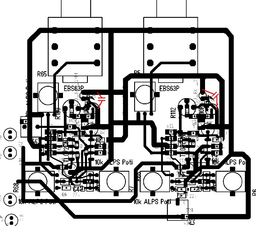 Hallo Thomas, sorry, ich habe diesen Thread garnicht bemerkt. Wenn du diese Boost-Funktion nicht brauchst, kannst du R30, R36 und R62 weglassen. Die verursachen nur einen zusätzlichen Laststrom für die beiden OPamps. R69 kann ebenfalls entfallen, wenn du einen FET-OPamp verwendest, der ja nur sehr kleine Eingangsruheströme hat. C43 ist wohl ein 2,2µF Kondensator, Folie? 2200µF wären ein bißchen viel. Ob für die Übersteuerungsanzeige ein zusätzlicher Buffer notwendig ist, siehst du so: Der TL072 kann eigentlich Lasten bis 2kOhm (und darunter) zuverlässig treiben. Wenn R66 und R68 am Linksanschlag stehen, sieht IC8a dort eine Last von 22k (R26) und 10k (R60) nach Masse. R4 und R9 machen nochmal 20k. Dann kommen noch R108 und R109, die in einer Worst Case Situation parallel und ebenfalls an Masse hängen. Macht also insgesamt 2,1kOhm (wenn du R30 wegläßt). Das könnte noch klappen ohne zusätzlichen Buffer. Allerdings hast du dann einen etwas geringeren linearen Ausgangsspannungsbereich bei IC8a, einfach mal ausprobieren. Was soll denn "K1" im Layout sein? Beim Layout stimmen noch ein paar Abstände nicht zwischen den Bauteilen, nicht wahr? Da warte ich mal mit meiner Analyse, bis du etwas weiter bist. @... >du solltest da vor dem Trimmer noch einen Buffer vorsehen. Also zwischen >IC8a und R109. Sonst bekommst du noch Rückwirkungen auf dein Signal. In einem Mischpult ist das, denke ich, hinnehmbar und wohl nicht hörbar. Einfach ausprobieren. Kai Klaas