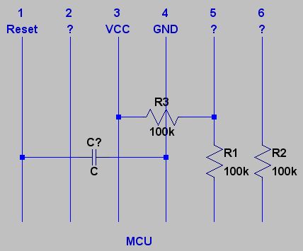 Ein paar Erkenntnisse konnte ich über die vorhandene Pinreihe gewinnen (Schaltplan siehe Anhang): 1.) Pin 1 ist offensichtlich Reset. Führt bei eingelegten Batterien VCC und es gibt immer einen sauberen Reset, wenn man GND anlegt. 2.) Pin 3 ist VCC, Pin 4 ist GND. Das Gerät kann hier auch mit Spannung versorgt werden, statt über die Batterien. 3.) Pin 5 + Pin6 müssen eine Funktion bei der Programmierung haben. Per Oszi läßt sich eindeutig erkennen, daß diese beiden Pins LCD Segmente versorgen (~250Hz, 1/4 duty cycle). Dabei scheint es so, als ob an Pin 6 eine einfache Segmentleitung des LCDs anliegt (Potentiale 0V -> VCC), und an Pin 5 eine Common Leitung (Potentiale VCC -> 0V). Verbinde ich Pin 5 mit GND, so leuchten zusätzlich zu den bereits aktiven Segmenten -alle- Segmente schwach auf. Verbinde ich Pin 6 mit GND, so leuchten lediglich einige aktive Segmente etwas schwächer. 4.) An Pin 2 ist keinerlei Aktivität festzustellen. Verbinde ich diesen mit VCC, so scheint das Gerät abzustürzen und/oder neu zu starten. Dabei kommt es auch zu Hängern oder Unsinn im Display. Das Verhalten ist eindeutig von einem "Reset" oder einem Kurzschluß VCC<->GND zu unterscheiden. Ich schließe daraus folgendes: - da es wenig Sinn macht, genutzte LCD Pins auf eine Stiftleiste herauszuführen, muß es sich um Pins handeln, die sowohl als Teil des LCD Treibers als auch als Teil der Programmierung verwendet werden. Damit scheiden die AVRs für mich erstmal aus, da die ISP Pins nicht entsprechend geshared sind. In dem Zusammenhang machen u.U. auch die 100kOhm Widerstände Sinn. - was auch immer für eine Programmiermethode das ist, sie muß offensichtlich mit 100kOhm in den Datenleitungen zurecht kommen können - diverse PICs haben die fürs ISP verwendeten RB6/RB7 Pins mit LCD Funktionen geshared, allerdings leider nicht eine Common Leitung Auffällig ist noch, daß das Gerät nach dem Einschalten/Reset kurz eine Versionsnummer anzeigt. Das wäre für miche in Indiz dafür, daß das Ding durchaus ein Flash Microcontroller ist. Ich hab jetzt so ziemlich alle mir bekannten Hersteller nach LCD uC abgeklappert (AVR, Microchip, NXP, NEC, EPSON, Holtek, Freescale, ST), und bis auf den PIC hatten keine eine gesharte LCD/ISP Funktionalität.... Vielleicht hat ja von Euch noch einer eine Idee. Unmodifiziert laufen die Dinger jedenfalls bei mir seit zwei Monaten problemlos. Gruß, Watz