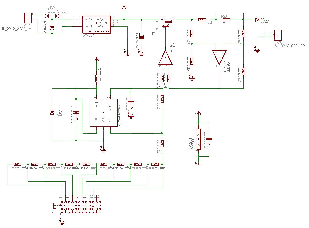 So langsam verstehe ich. Als ADJ Version ist der LM4121 sozusagen so etwas wie ein Linearregler wie der LM317, nur nicht so leistungsfähig, dafür präziser. Beim angesprochenen LM10 ist der Kondensator zwischen invertierendem Eingang und Ausgang des OP. Das heißt ich müsste das bei meinem linken so anschließen und rausfinden bei welchem er stabil ist, aber trotzdem schnell genug regelt? Die Situation dass beim Umschalten der Schalter kurzzeitig geöffnet ist führt dazu dass der ADJ Widerstand unendlich hoch wird und damit die Spannung und Strom in die Begrenzung gehen wenn ich das richtig verstanden habe. Nicht schön, das stimmt. Aber in meinem Fall stört das nicht, selbst wenn der Verbraucher angeschlossen ist. Die Drähte die bei R20 weggehen, gehen zu einem hochohmigen Anzeigeinstrument. R20 dient als Shunt für ein Amperemeter (was in wirklichkeit ein umskaliertes Voltmeter ist).
