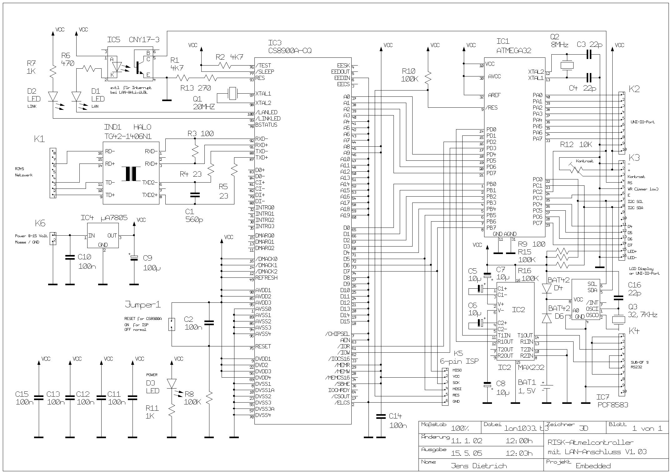 Hallo, ich versuche im moment einen Sicherungsüberwachung für bis zu 100 Sicherung zu entwickeln. Dachte da so an eine 10x10 Matrix zur überwachung. Habe mir sagen lassen das man für die Überwachung den ATMega88 gut beutzen kann. Mein Problem ist das ich die erfassten Daten über eine RJ45 Schnittstelle an ein EDV-Sytem übermitteln möchte. Ich habe nur leider bis jetzt keine beispiel verschaltung gefunden die ich für meine Projekt abwandeln kann. Dass einzigste was ich bis jetzt gefunden habe ist eine Schaltung mit einem ATMega32 Controller. In der Schaltung ist ein CS8900A verbaut, der die verwaltung über den RJ45 macht. hier der Link zu der Page: http://www.icplan.de/seite15.htm ATMega88 und ATMega32 haben beide 36 I/O Ports. Bei der 10x10 Matrix fallen dann schon 20 Ports weg. Für die Übertragung zum CS8900A brauch ich 8 Leitungen (7 Leitungen = max128 Sicherungen / 1 Leitung für die übermittlung Spannung vorhanden Ja/Nein) Ich glaube dann brauche ich noch 3 Anschlüsse für den µC um diesen zu programmieren. Außerdem brauch der µC eine Leitung die Ihm sagt das er die erfassten Daten senden soll Desweiteren wollte ich noch ein Mäuseklavier integrieren um den Standort der Überwachung direkt am Board einstellbar zu machen. Dafür brauche ich warscheinlich 24 Eingänge. Kann ich die auf den CS8900A legen ? Hat jemand das schon mal ausprobiert oder kann mir ein paar tipps geben.