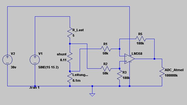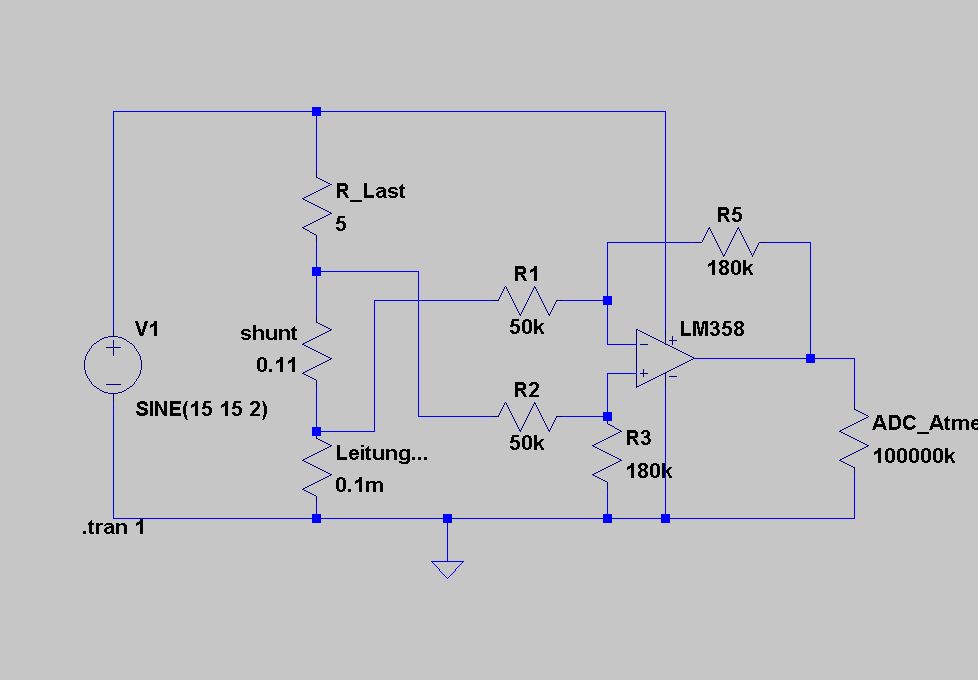 Hallo, ich wies das Thema ist hier sicher schon mehrmals durchgekaut worden. aber ich habe nichts gefunden. ich möchte mit meinem Atmel den Strom messen. ADC Rev 2,56 V Strom von 30mA - 5A ... Dazu habe ich einfach einen Differenzverstärker verwendet. (LM 358) jetzt zu meinem Problem das Signal ist ziemlich unsauber. Deshalb würde ich die ganze Schaltung gerne etwas "Träger" und "Konstanter" machen. Dazu kann ich einen Kondensator an die Eingänge hängen. Ich liebäugele aber auch mit einer 10uH Spule am Eingang. Daher meine Frage. Solange doch kaum Strom in die Schaltung fließt ist doch so eine Spule am Eingang ziemlich sinnlos. Ich bin für jede Anregung dankbar Grüße Tom