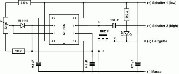 > und ersetz den 0,1uF gegen ein 100uF. Nicht 100, 1 schrieb ich, bei 100 ergibt sich ein auffälliges Verhalten beim Einschalten, da dimmt die Schaltung nicht ordentlich. (cih hab nach wie vor keine Ahnung, was der 100uF Elko in deiner Schaltung soll). > Dann probier ich das mit der Diode vor der Schaltung, Das ist zwar eine Lösung, die wurde aber bei Trafos als Spannungsquelle vorgeschlagen. Bei einem Autoakku kannst du den 470uF weglassen, wenn die Zuleitungskabel für 10A dick genug sind. Schaden tut es natürlich trotzdem nicht, wenn du über die Diode die Schalung von der Halogenlampe entkoppelst, dann bleibt sogar der 470uF heil (und muss nicht auf 4700uF aufgeblasen werden, im Gegenteil, 47u täten es auch). 1N4148 Batteri --+--|>|--+-- Schaltung | | Lampe 470uF | | MOSFET I|--- | | Masse