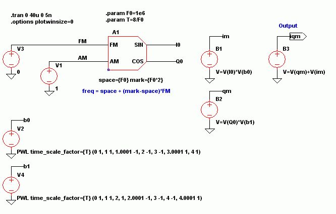 Bastler schrieb: > Hallo zusammen, > > ich bin es (schon) wieder ;-)! Nachdem die Simulation mit den > gekoppelten Spulen gut klappt stehe ich mit LTSpice vor einem neuen > Problem: > Wie Kann ich ein Sinussignal in der Phase und Amplitude springen lassen? > Ich habe einen Vorverstärker aufgebaut und will simulieren, was der mir > aus Signalen die mit QPSK oder QAM moduliert sind macht. > Ich habe versucht in einer Sinusquelle für den Phasenwinkel eine > Variable einzugeben und diese mit einer weiteren Spannungsquelle zu > steuern, habs aber nicht hinbekommen. Wie kann man das machen? > > Gruß Bastler Das Herz des IQ-Modulators ist der Oszillator mit Sinus- und Cosinus-Ausgang. Dafür gibt es unter [SpecialFunctions] ein Bauteil "Modulate2". Zum Multiplizieren und Addieren gibt es die B-Quellen. Genaugenommen kann man da beliebige Formeln eingeben. Beispiel für QAM Multiplikation mit einer Bv-Quelle: V=V(Q0)*V(b1)*V(a0)