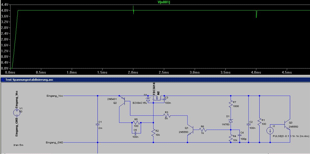 Hallo, ich habe mir mal in LTspice einen lowdrop Regler aufgebaut. Das ganze ohne richtigen Grund. Wollte mal ein bisschen schauen welche Probleme es gibt bezüglich Schwingungen etc. Nun Frage ich euch, ob ihr mir Anregungen zum Verbessern geben könntet. Z.B. besseres Regelverhalten, Größerer Eingangsbereicht, keine Schwindungen mehr etc.. Im Moment habe ich die Eingangsspannung auf 50V DC eingestellt und die Ausgangsspannung auf ca. 4V DC. Das erste Problem währe, das es sehr langsam ausregelt. Nach Veränderungen der Last steigt die Spannung kurzzeitig hoch. Das 2te währe, dass der Regler bei niedrigen Spannungen das Gate nicht schnell genug entläd, wodurch die Regellung noch langsamer wird.