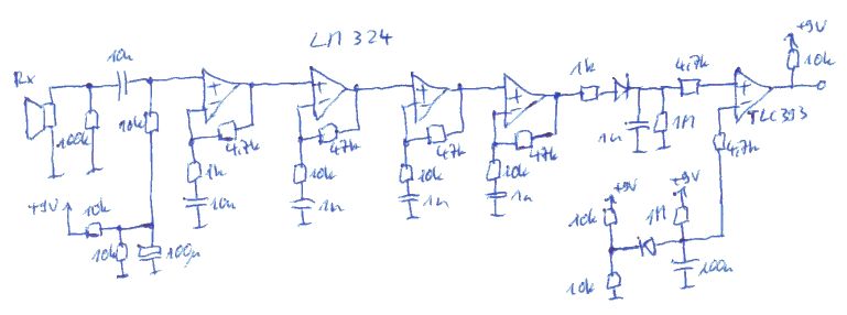 Hallo Waldgichtel, dein Bandpaßfilter hat eine Eingangsimpedanz von nur rund 150 Ohm. Ist das gewollt? Ich glaube nicht, daß das ein vorangehender OPamp sehr mag. Für das Verstärken und Auswerten der Signale von Ultraschallmikrofonen wird gerne eine Schaltung wie im Anhang verwendet. Die 10k/1n (bzw. 1k/10n) Hochpässe und die endliche Bandbreite des LM324 ergeben in der Regel genug Bandpaßcharakteristik. Kai Klaas