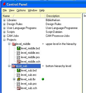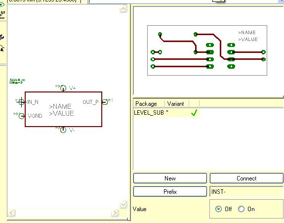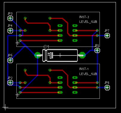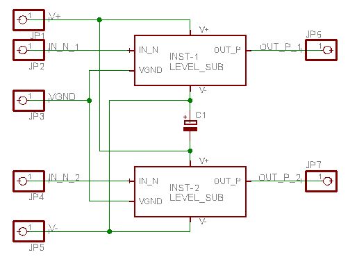 Ich hab mal versucht Eagle mit 'ner einfachen Hierarchie zu benutzen. Die Grundzelle ist ein invertierender Verstaerker (2R+OPV, Schematic = level_sub_sch.gif / Board = level_sub_brd.gif). Das ist noch ganz einfach. Fuer die Hierarchie soll dann daraus eine Library-Element werden, welches wieder aufgerufen werden kann.