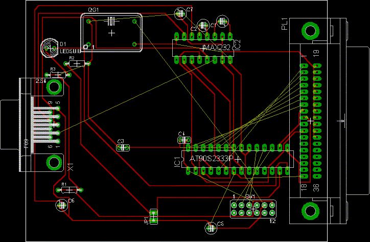Hi Niki, hab dir mal von Hand nen Lösungsvorschlag für die Problemzone zwischen AVR und Centronics gemacht. Ist sicher nicht perfekt, aber vielleicht als Einstiegspunkt geeignet. Noch ein Tipp: klicke beim Anordnen der Teile ab und zu mal auf das "Ratsnest"-Symbol, dann werden die kürzesten Luflinien berechnet und man verliert nicht den Überblick. MfG Andreas