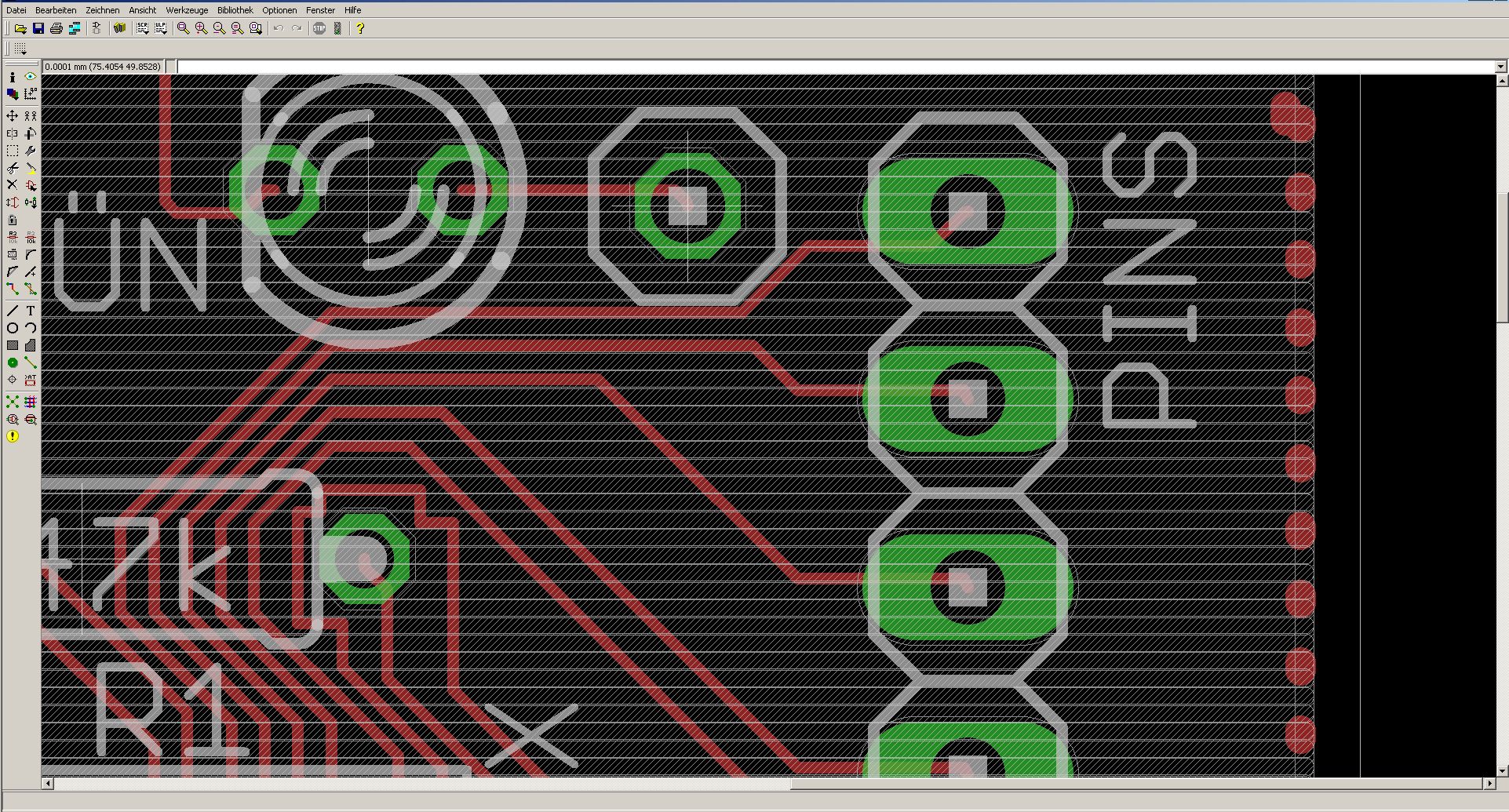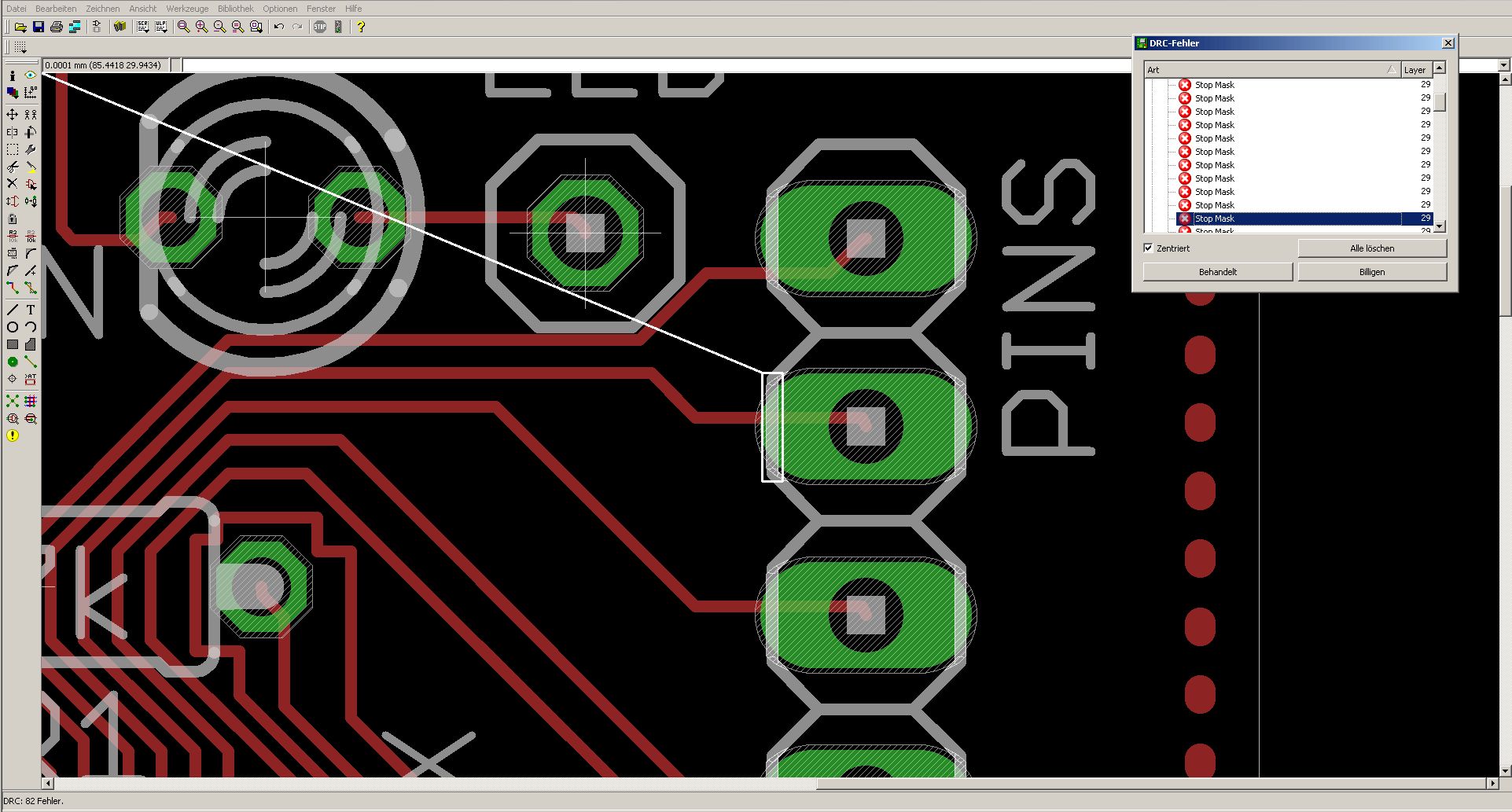 Hi, ich habe mit Eagle eine kleine Platine entworfen und will sie nun ätzen lassen. Da im Preis Lötstoplack mit inbegriffen ist, will ich den natürlich mit nutzen. Wie mache ich das? Lege ich einfach mit Eagle einen Polygon im Layer 29 (tstop) über die ganze Platine und Eagle macht den Rest? Wenn ich das so mache, bekomme ich ewigviele Probleme bei der Gültigkeitsprüfung. Und auch wenn ich nur den Layer29 sichtbar schalte bekomme ich auch ganz ohne dieses Polygon Fehlermeldungen (siehe Anhang). Danke für alle guten Ratschläge! Matze