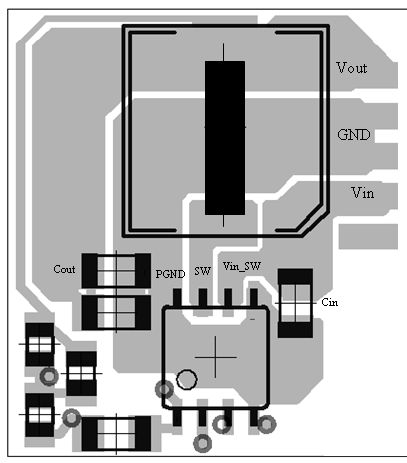 Anbei das Layout. Habe die Spule mit einem Symbol ergaenzt so dass der Stromverlauf klar wird. Das einzige was ich als Besserung sehe ist C_in direkt zw. Pin Vin_SW und PGND zu legen und als Konsequenz das Signal SW auf die Unterseite zu bringen. Jedoch habe ich hier bedenken hinsichtlich der Vias - nicht genug Platz um mehrere unter zu bringen.